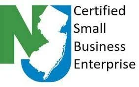 Logo with green and blue colors and a map of New Jersey, with text 'Certified Small Business Enterprise'